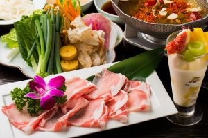 セット内容(野菜・金星豚・鍋の〆(うどん)・デザート・コーヒーもしくは紅茶)